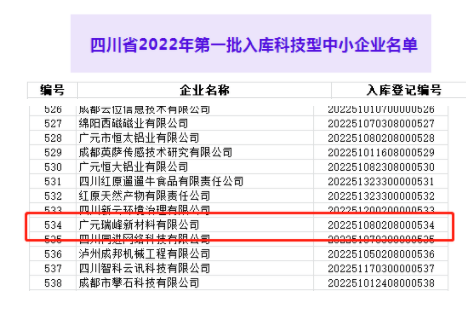 關鍵詞: 廣元瑞峰新材入庫四川省2022年第一批科技型中小企業名單