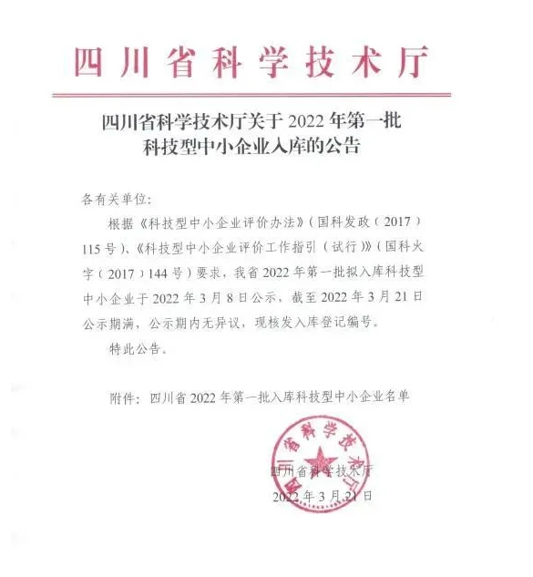 四川省2022年第一批擬入庫科技型中小企業于2022年3月8日公示,截至2022年3月21日公示期滿,公示期內無異議。近期,四川省科技廳核發入庫登記編號。