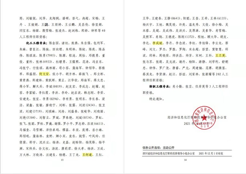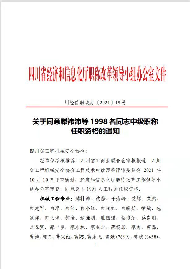 經四川省工商業聯合會審核報送,四川省工程機械安全工程技術中級職稱評審委會2021年10月10日評審通過,經濟和信息化廳職稱改革工作領導小組辦公室審查同意,何文安、王蘭英、李成斌、王何道4人獲化工類中級工程師職稱。